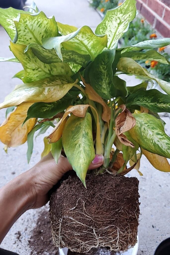 Unfortunately, in most cases, leaf yellowing due to overwatering goes hand in hand with fungal infections. You need to act fast, or your dieffenbachia is doomed. Start by transplanting it into a new container with fresh potting mix, cutting away all the damaged roots.